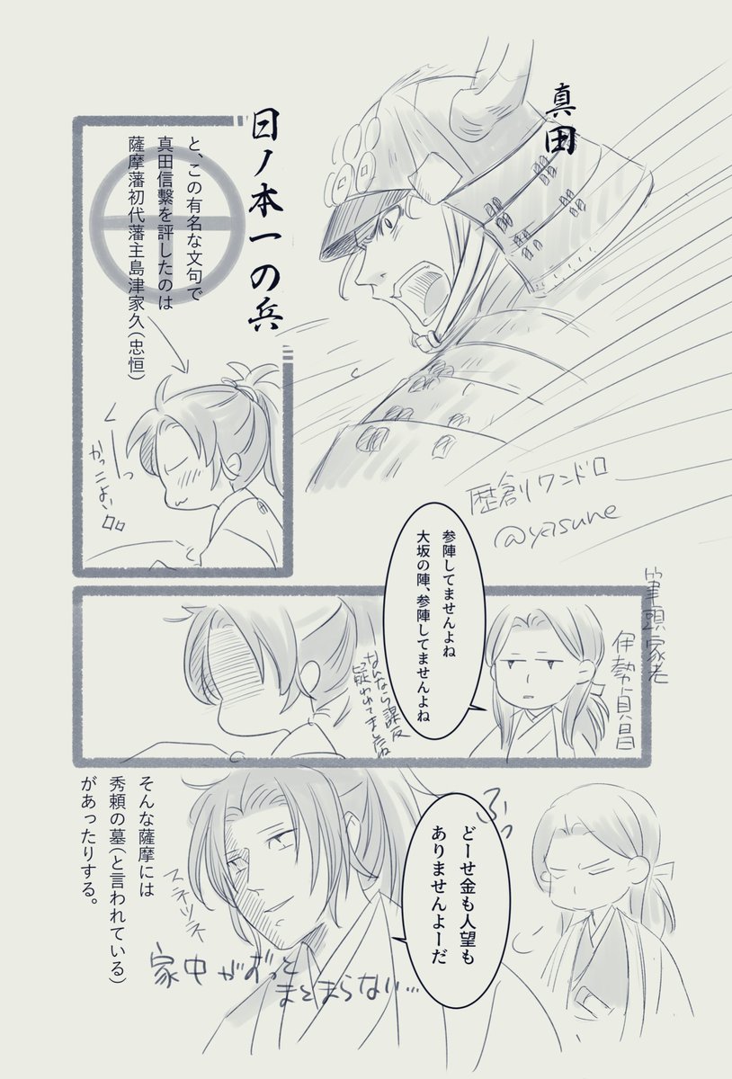 #歴創版日本史ワンドロワンライ 遅刻参加です💦(久々参加) お題「日の本」 日の本一の兵の言葉で真田信繁を褒めたのは島津の殿様ですが、実は大坂の陣は参戦してなかったり(見てきたかのように言う) そんな薩摩へ信繁と秀頼が落ち延びてきたとか来ないとか。