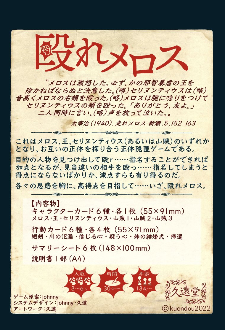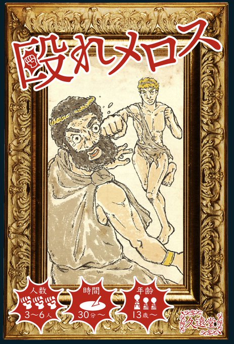 【お知らせ】 #アナログゲームフェスタ 合わせの新作『#殴れメロス』、パッケージが完成しました! いや絵面がヒドい!!(;´д`) メロスか王かセリヌンティウス(4人以上だと+山賊)となり、互いの正体を探り合いつつ、殴る相手を探す正体隠匿ゲーです。 イベント価格¥1000!(3〜6人/30分〜/13歳〜)
