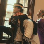【金カム撮影舞台裏】待ち時間編 同時にスマホをいじるゴトリ ・片手操作のアシㇼパさん ・片手で押さえて操作する白石 ・両手持ちで操作する杉元 (操作の仕方が全員バラバラ) photo : @RYU_MADEINJAPAN #殺人ホテル0221