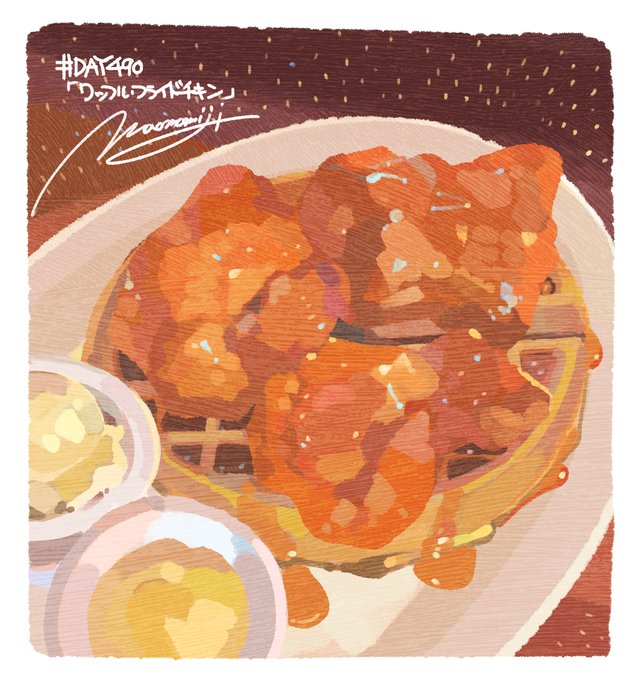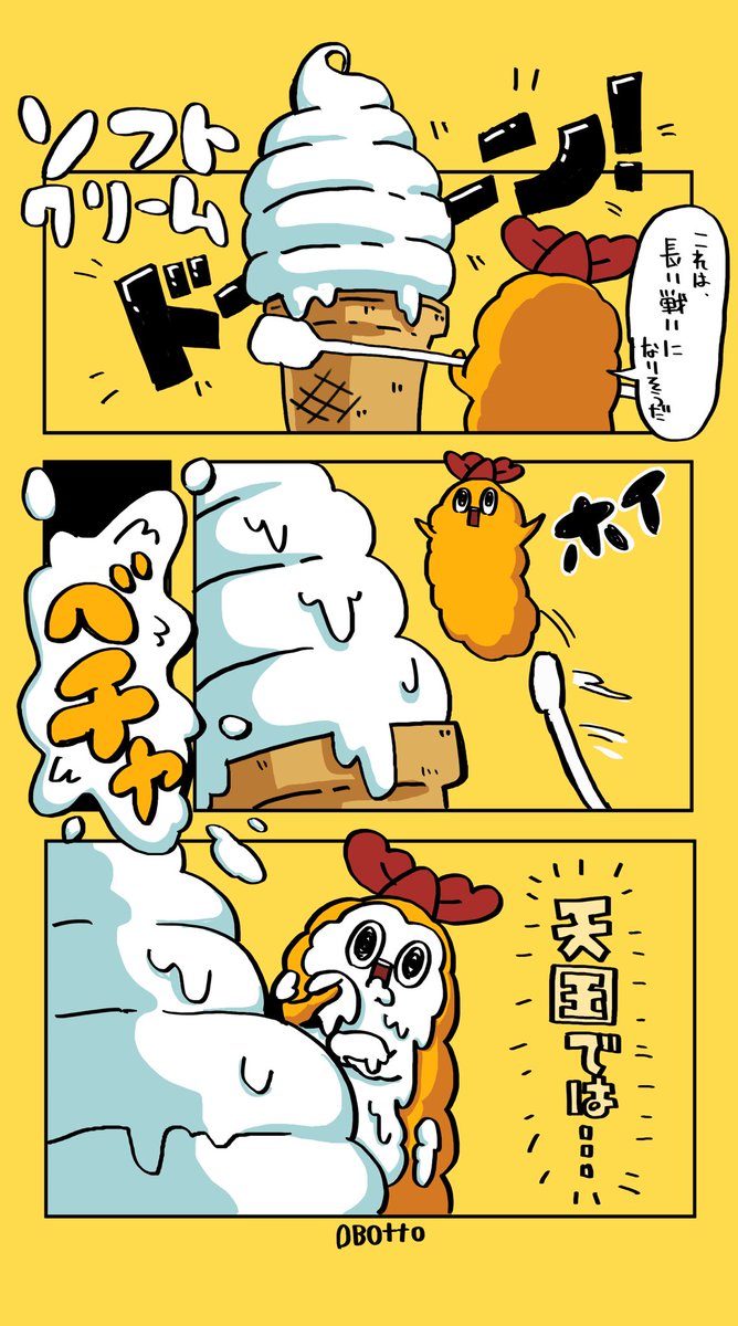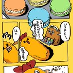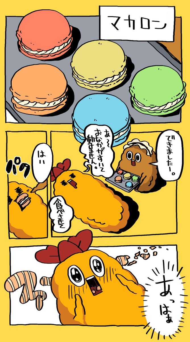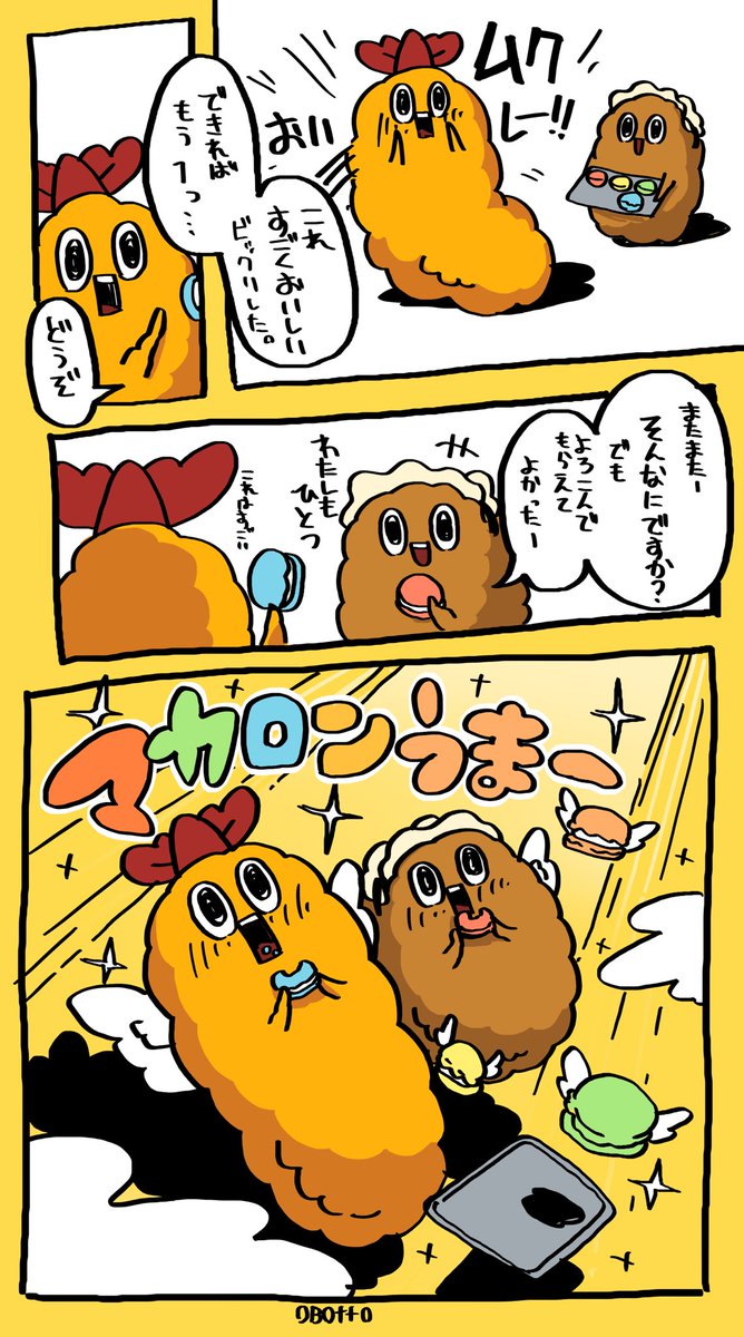 【#エビフライくんを満腹に】 エビフライくんにマカロンをあたえました₍₍ (ง ˘ω˘ )ว ⁾⁾ カキフライちゃんも一緒です。 #漫画が読めるハッシュタグ #イラスト #毎日更新 (※コメントで食べ物を与えれます)