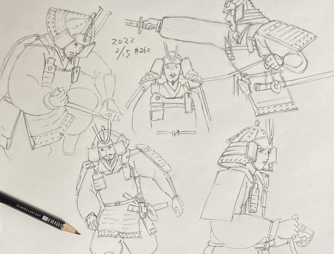#毎日積み上げ (2022/2/15/19:01) 260日目. 夕食前のラクガキ. 平家物語の第五話を観ながら. 大鎧の省略形はこう描けばいいのかと感心しきり. 小札錣の重ね合わせとか. #スケッチ #平家物語 #侍 #イラスト練習中 #絵描きさんと繋がりたい #イラスト好きさんと繋がりたい