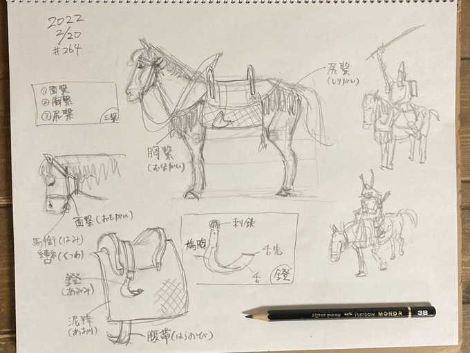 #毎日積み上げ (2022/2/20/21:20) 264日目. 夕食後のラクガキ. 和式馬具の研究. 平安&鎌倉武士を描きたいので在来馬を練習せねば. #スケッチ #侍 #木曽馬 #イラスト練習中 #絵描きさんと繋がりたい #イラスト好きさんと繋がりたい