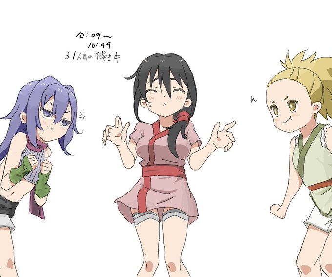 @peacefullforone #毎日30分でちょっとずつ一枚絵を描く #くノ一ツバキの胸の内 題材『くノ一ツバキの胸の内』、55日目です。 完成しました。最後は編集に1時間半かかり、描き終わるまで28時間半かかりました。長かったです。今まで見て下さった方ありがとうございました。全員集合は難しかったので班ごとに分けました。