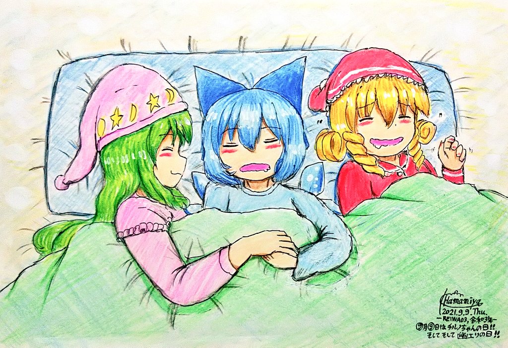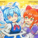 もしもしちょっと道のお訪ねを あら、美味しそう♪ #チルノ #宇佐見蓮子 #マエリベリー・ハーン #深夜の真剣お絵描き60分一本勝負 (東方版・1698回目参加・お題フリー) (※3月8日お題) #毎月九日はチルノの日 #毎月9日はチルノの日 #秘封倶楽部の日