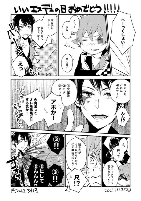 いいエスデュの日だ~~~~~!!!!!! エス「③って言ってんじゃん!②!②でもいいから!」 デュ「エスデュの日だから、①と②を選ばないといけないんじゃないか?」 #毎月12日はエスデュの日 #twst_BL