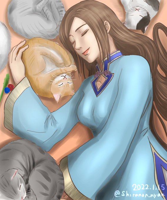 #毎月15日は蔡文姫の日 今年もよろしくお願いします! 新年なので虎さん…はもう描いたのでトラ柄の猫さんと仲間たちに囲まれてながら眠っていると可愛いなぁ…🐈猫も描くの苦手だけどチャレンジしてみました!