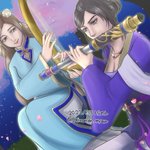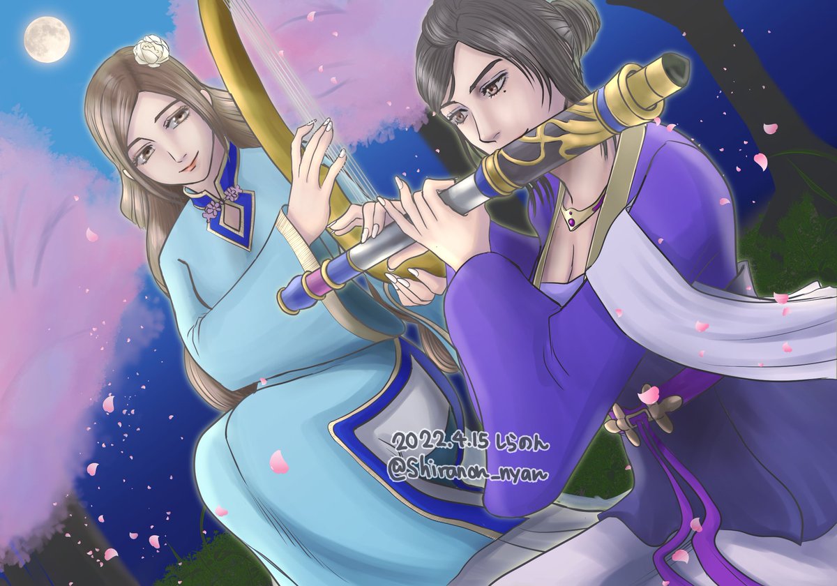 #毎月15日は甄姫の日 #毎月15日は蔡文姫の日 甄姫さんのタグ、初めてお借りします🙇 夜の桜の舞う中、二人で旋律を奏でる姿を思い浮かべて描いてみました。甄姫さんは初めて描くのでドキドキしています💦