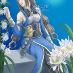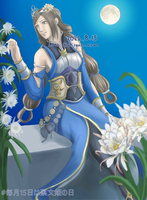 #毎月15日は蔡文姫の日 本日はタグ2周年! ちょっと原点に戻って月夜の中で花とともに佇む文姫さんにしてみました。奥のお花は手書きでちょっと失敗しましたが、手前のお花は素材お借りして綺麗に彩らせてもらいました✨