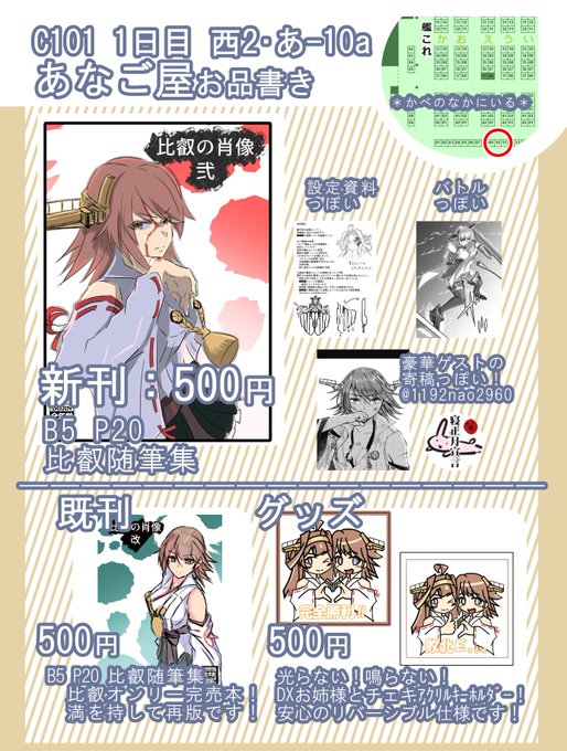 #C101新刊 #艦これ #比叡 #金剛 サークルあなご屋冬コミのお品書き、 ここに罷り越してございます! 珠玉の比叡かっこいい本、第二弾!٩( 'ω' )و クッソ遠方の比叡推しも安心の通販対応! 新刊/既刊通販:melonbooks.co.jp/detail/detail.… twitter.com/gaming_aNaGo/s…