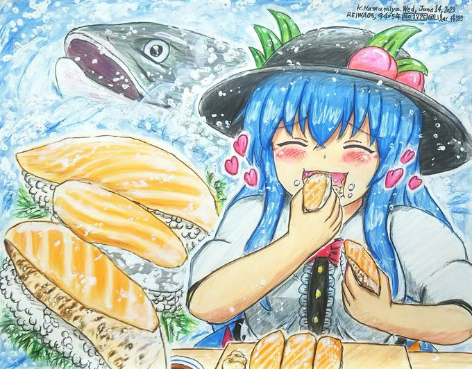 サーモン!こんなにも旨いものだったのね!もっと持ってきて!💕🐟 +25分 (1時間25分) #比那名居天子 #深夜の真剣お絵描き60分一本勝負 (東方版・1775回目参加) (※2022/5/24お題)