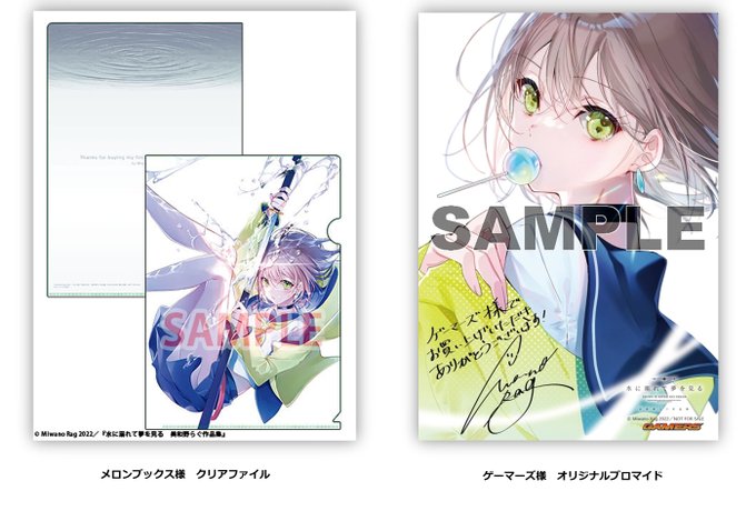 【画集購入特典】 #水に溺れて夢を見る ■メロンブックス様 特典:クリアファイル melonbooks.co.jp/detail/detail.… ■ゲーマーズ様 特典:オリジナルブロマイド gamers.co.jp/pn/pd/10594990/