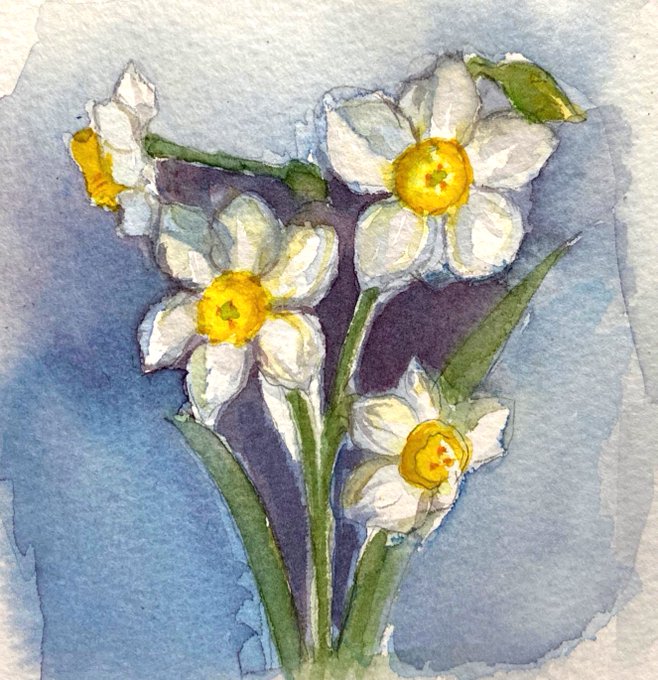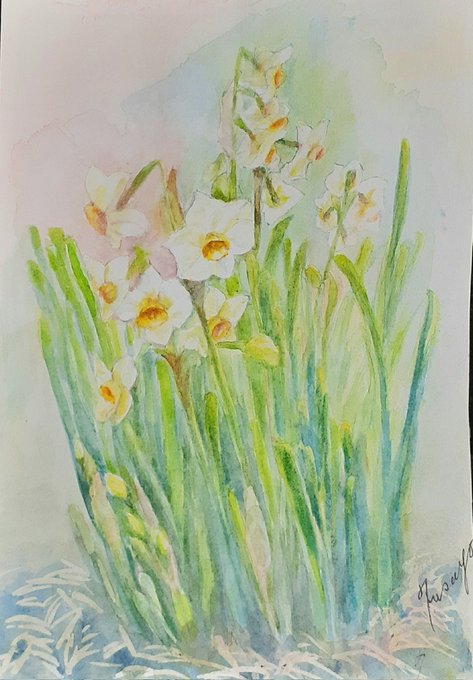 #過去絵を投げて絵を描いた気になろうキャンペーン 今年は、「水仙」描かずに終わりそうなので、去年の水仙を見て下さい🙏🏻 #Watercolor #水彩画 #風景画 #透明水彩 #landscape #水仙 #アナログの本気