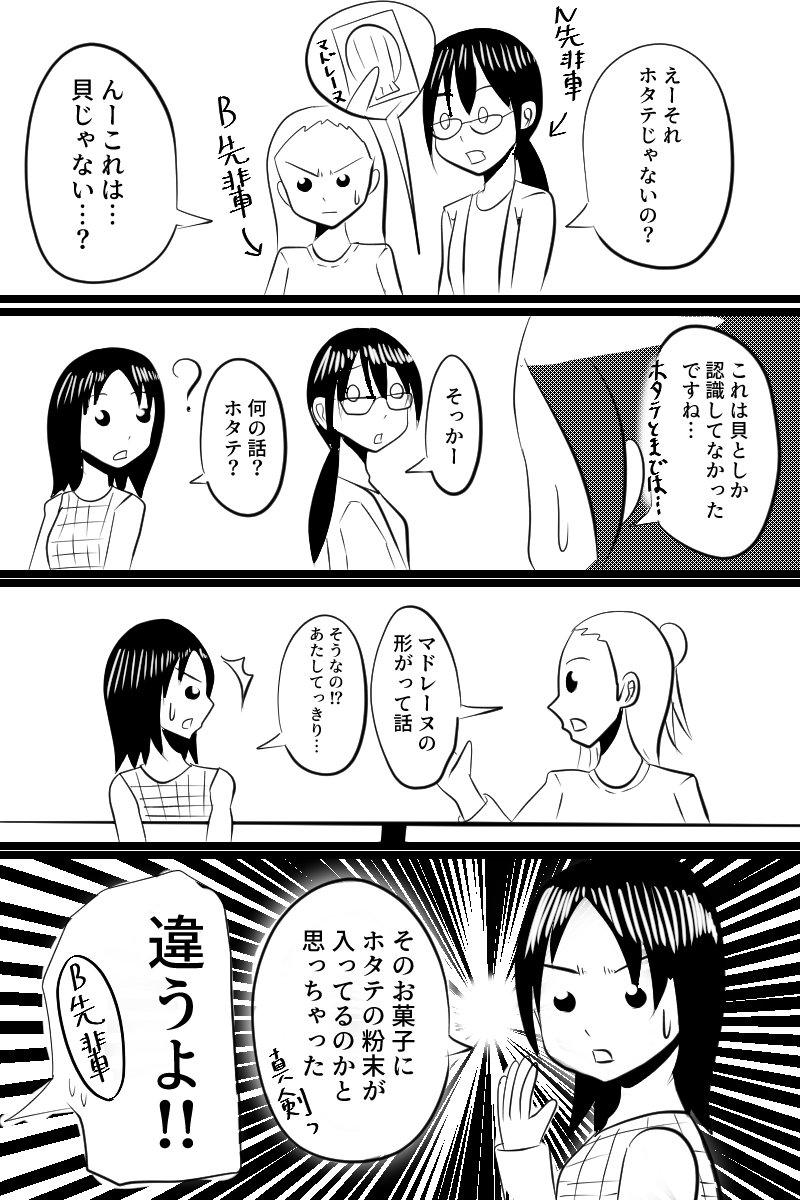 ※エッセイ漫画注意 マドレーヌの形はホタテ? ※先輩に掲載許可貰ってますって書き忘れたので再投稿すみません🙇 #絵描きさんと繋がりたい #漫画が読めるハッシュタグ #水岸のコミックエッセイ #コミックエッセイ #エッセイ漫画 #日常漫画