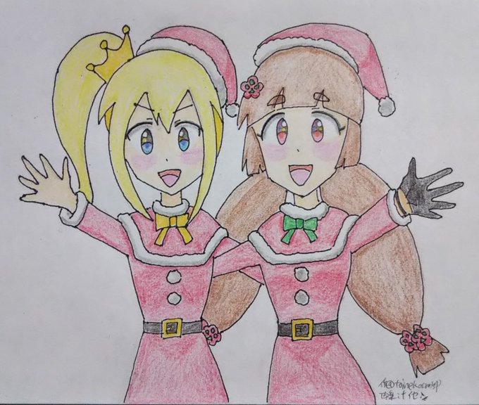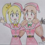 サンタさんな #八王子たん 、#水戸たん 描きましたー!(*≧∇≦)ノ🐈️ 「メリークリスマス!🎉✨🎁✨」 #クリスマスイラスト #ビッカメ娘 ( #ナイセン ) #ビッカメ娘を描き隊 #ファンアート #色鉛筆 #絵描きさんと繋がりたい
