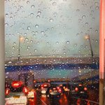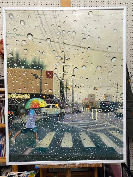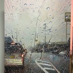 『 帰路につく どしゃぶり 』 油彩、F80号キャンバス 2022年制作 #絵描きさんと繋がりたい #絵柄が好みって人がいればいいなぁ #みんなで楽しむTwitter展覧会 #油絵 #水滴 #傘 #夕立