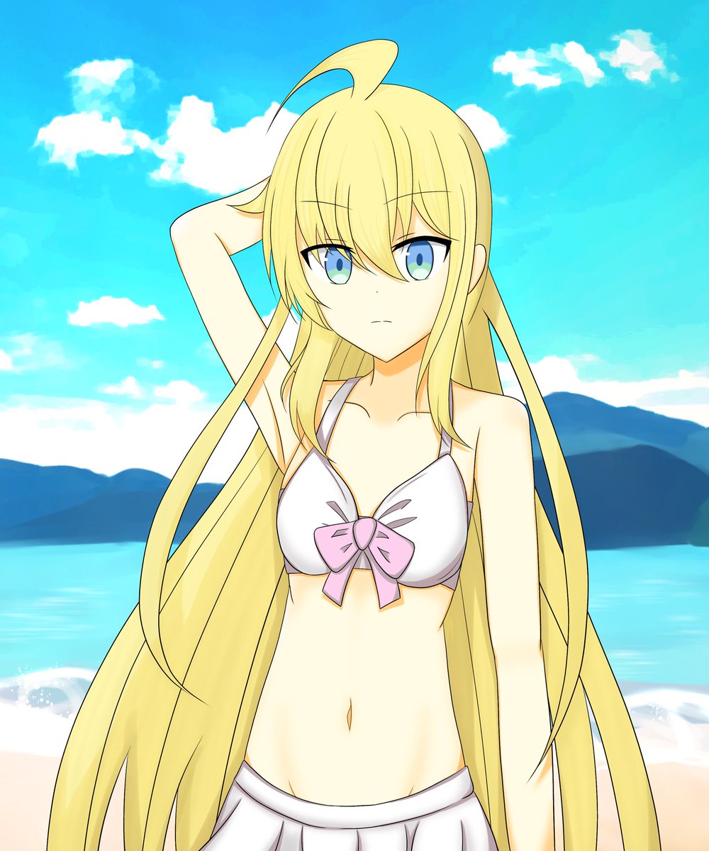 背景はMr. AIに頼んでみました Mr. AIは気分屋なハードボイルドのようです 良い仕事をしてもらうにはこちらの依頼の仕方が重要なようです(要するにガチャ🤖) #水着イラスト #ビキニ #絵柄が好みって人にフォローされたい