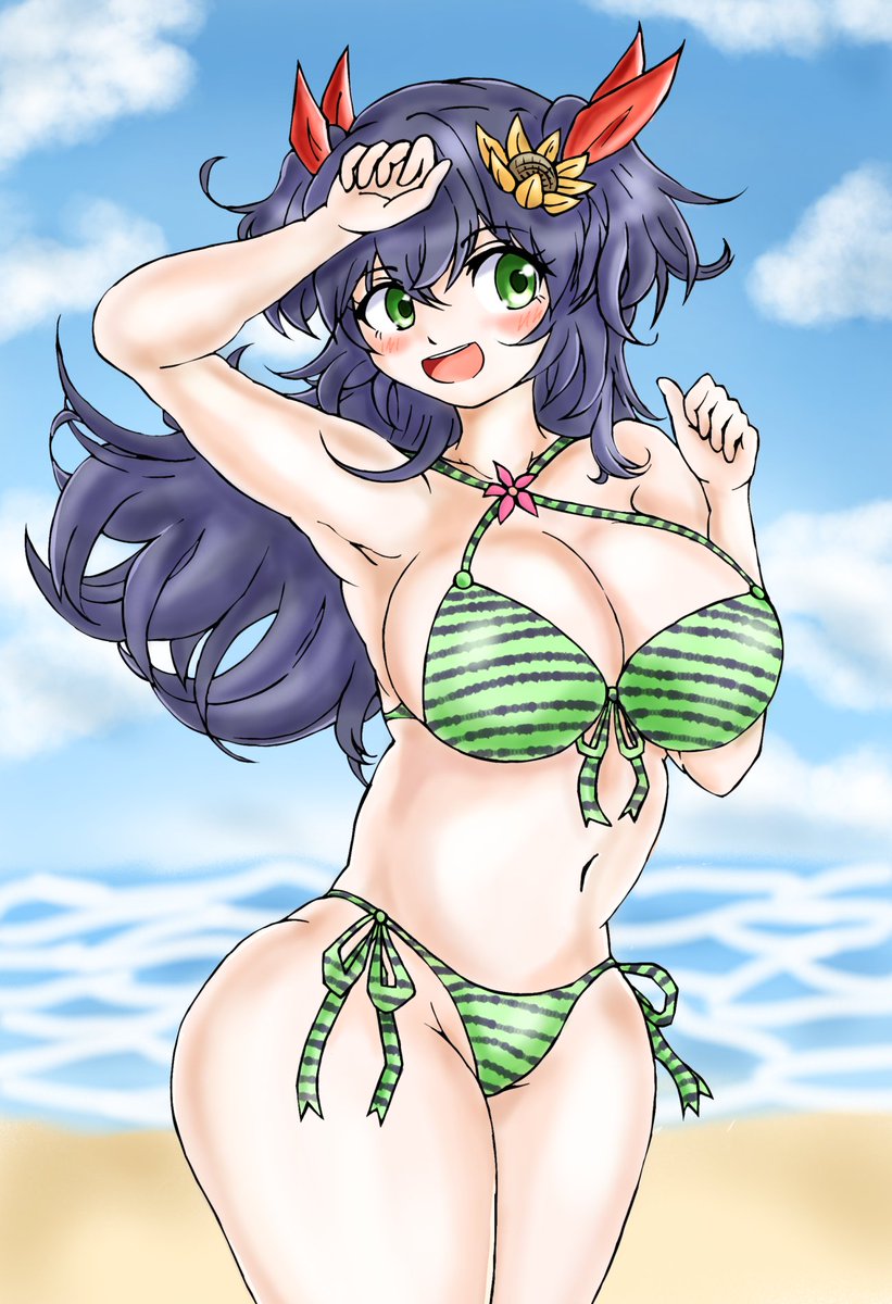 背景はMr. AIに頼んでみました Mr. AIは気分屋なハードボイルドのようです 良い仕事をしてもらうにはこちらの依頼の仕方が重要なようです(要するにガチャ🤖) #水着イラスト #ビキニ #絵柄が好みって人にフォローされたい