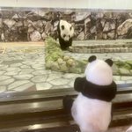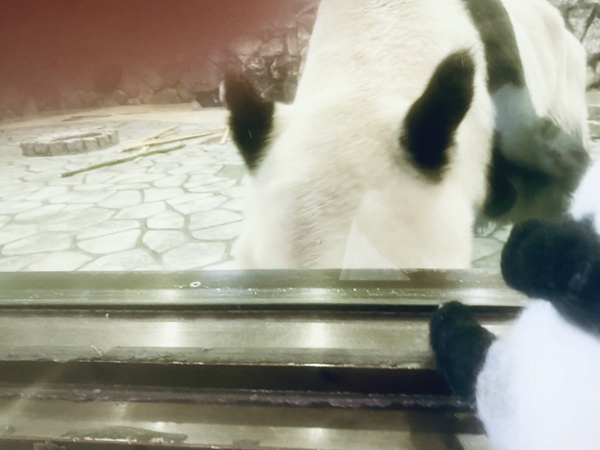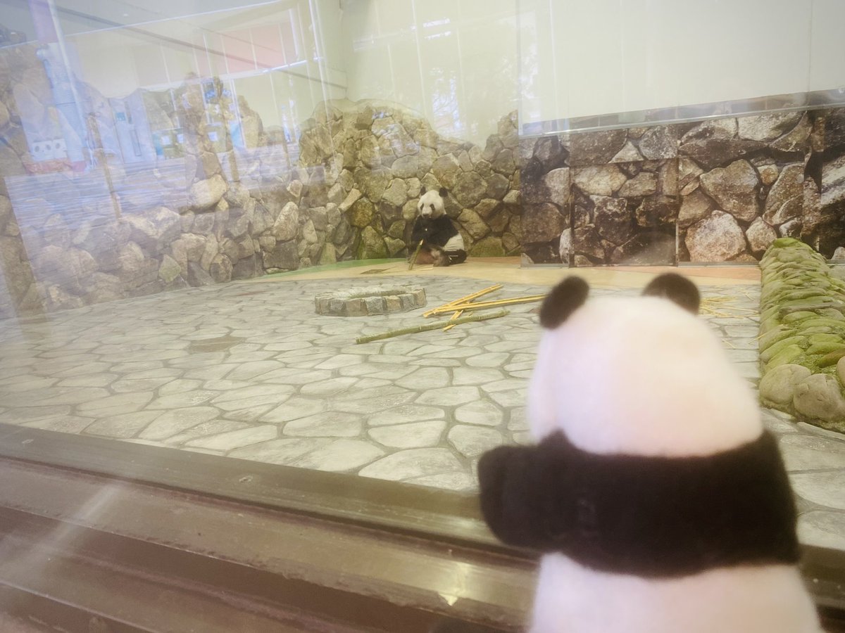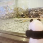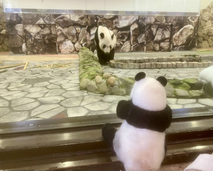 はつたんちゃん、初めてのおつかい🐾② 🐼🥕永明さん、気付いてくれた❣️くれた…うわぁぁぁ💦 めっちゃ近くまで来てくれたので驚くはつタンと私の指✌️🤣 #はつタンはタンタンさんからの伝言を永明さんに伝えたい #永明 #羊毛フェルト #タンタン #アドベンチャーワールド