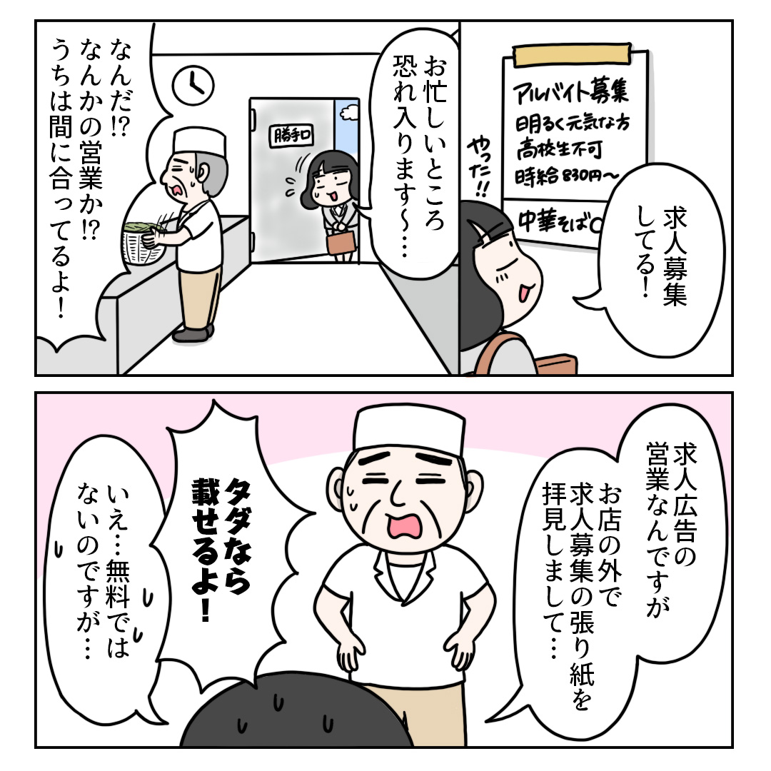 4コマ漫画『夏休みのあるラーメン店』 . 自由で気負わず美味しいラーメンを提供するオーナーさんでした。人気店になるには多少のハッタリも必要だそうです😅 #4コマ漫画 #求人広告 #求人広告営業4コマ絵日記