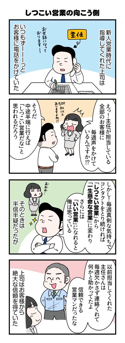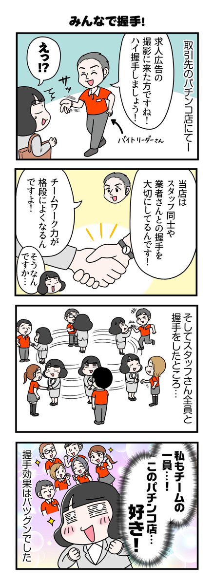 4コマ漫画『みんなで握手!』 . 仕事で握手する機会はあまりないですが、心の距離は間違いなく縮まると思いました😊 (今はご時世的に難しいですけど…!) #4コマ漫画 #求人広告 #求人広告営業4コマ絵日記