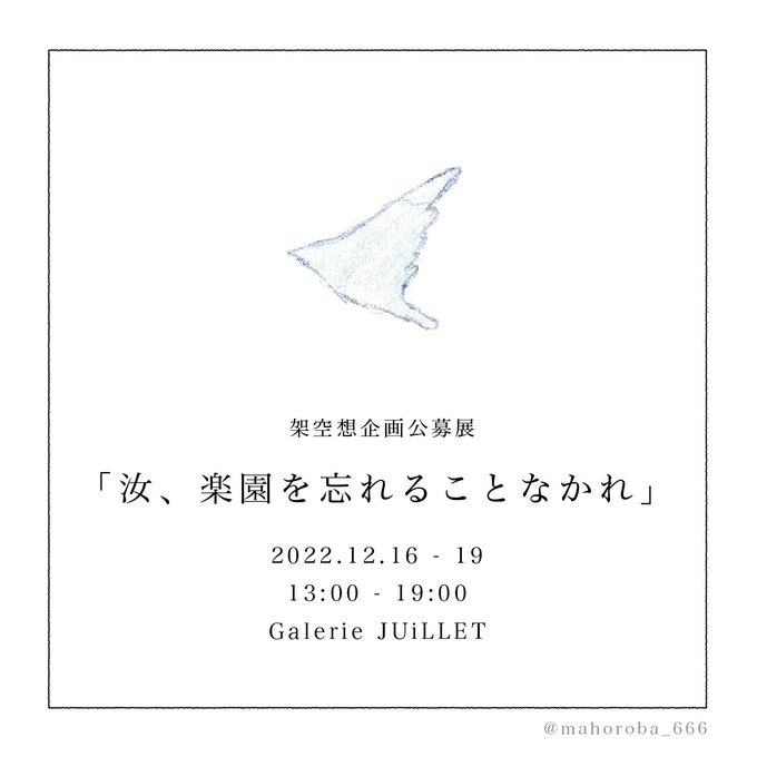 📯おしらせ💭 架空想様主催『#汝楽園を忘れることなかれ 』(@canaan_kikaku) ✴︎2022.12.16(fri)~19(mon) ✴︎13時~19時(初日14時~ /最終日・~17時) ✴︎ギャルリー・ジュイエ様(東京・高円寺) 大きめ額装2点、額装ATC1点、ミニ原画2点と 作品集を送りました! どうぞ、よろしくお願いします🙌