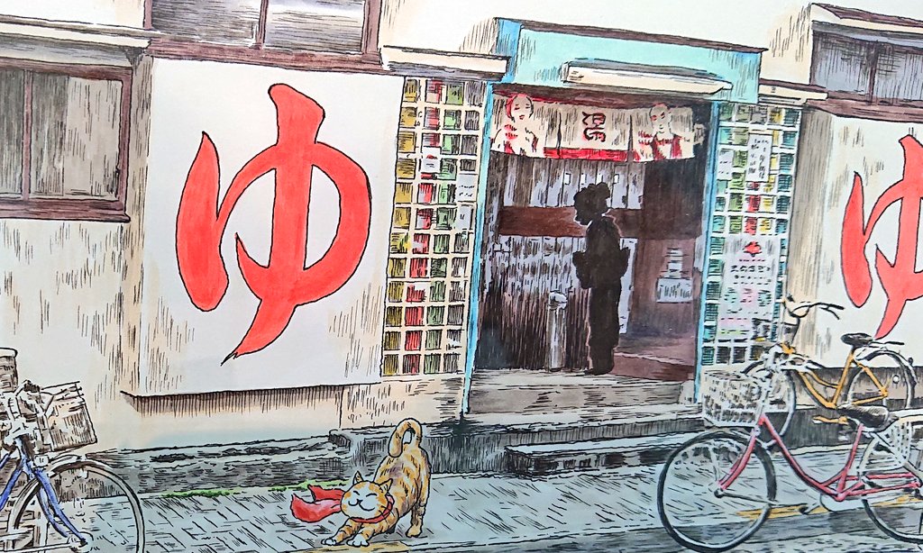 昨日はたくさんのご来場ありがとうございました。 本日は午後から沖山潤先生が在場します。 皆様のお越しをお待ちしております。 沖山の絵は、じっくり見るといろいろ発見があります。写真は赤い手拭いをマフラーにした猫のいる横町の風呂屋の風景😆 #イラスト #イベント #江東区文化センター