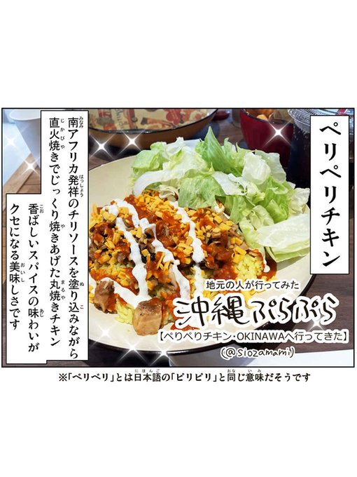 地元の人が行ってきた沖縄ぷらぷら 【ペリペリチキン・OKINAWAへ行ってきた♪ 】① ピリ辛うま幸せな #チキンオーバーライス✨ サイト↓ okiota.jp/oki2023-peripe… #おきオタ #沖縄 #沖縄グルメ #ペリペリチキン #チキンブリトー #沖縄ぷらぷら #レポ漫画 #漫画が読めるハッシュタグ