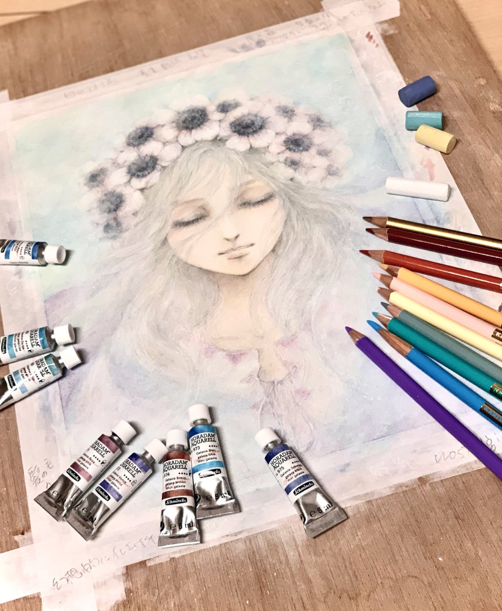 《ウンディーネ》 水の精霊、今日雨の中、傘の端から滴る水滴を見てふと、雨、川、雲、海、水道水…、水ってすごいのだなと改めて思いました。 #イラスト #ウンディーネ #アナログ #油性色鉛筆 #メルツペン #絵師さんと繋がりたい #イラスト好きさんと繋がりたい #みんなで楽しむTwitter展覧会
