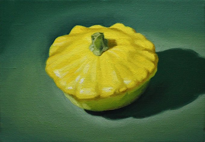 1時間10分くらいで描いたUFOズッキーニ。 見た目が面白いし、描いていて楽しいモチーフ。 原画はベジボーイキッチンで展示中。 #油絵 #oilpainting ↓メイキング動画↓ youtu.be/PwaSgebGWns