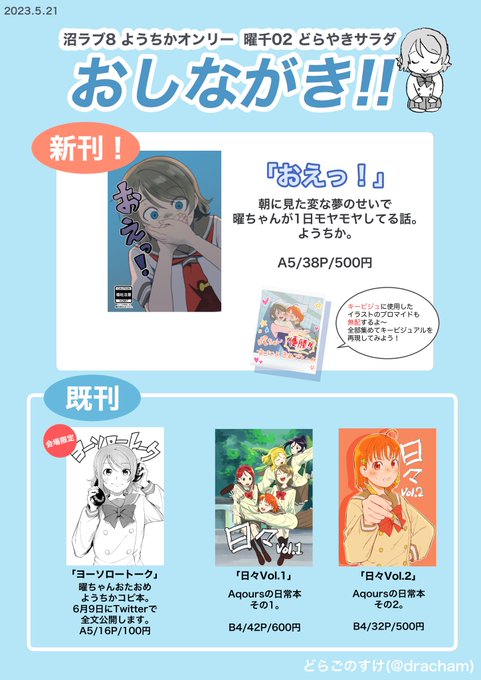 【おしらせ】 5/21(日)僕ラブ!サンシャインin沼津8に 久しぶりにサークル参加します!☀️ 2018~2021年に発行した既刊を14種類持っていきます!📘 委託にない本もありますので、この機会に是非よろしくお願いします!! 委託先↓ melonbooks.co.jp/circle/index.p… #僕ラブ #沼ラブ8