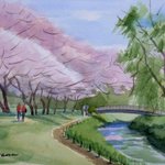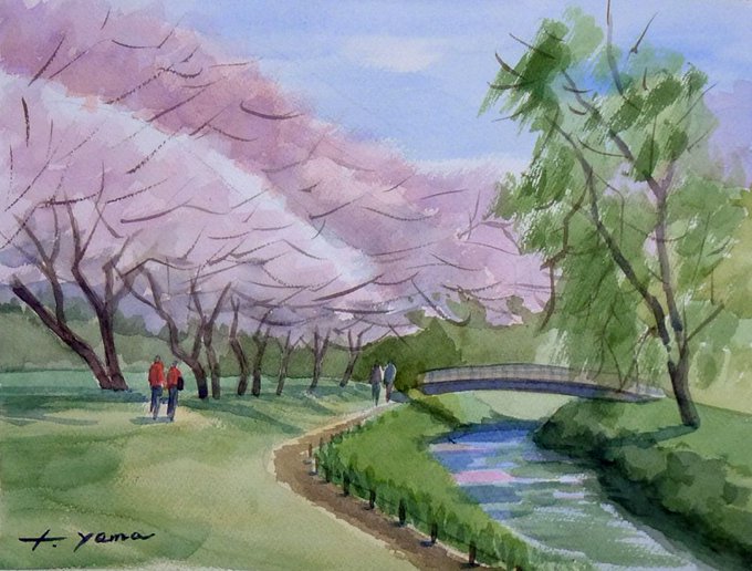 #水彩画 #透明水彩 #風景画 #スケッチ #Watercolor #Landscape #Landscapepainting #Watercolorpainting #sketch #大和市、#泉の森、#桜 が満開でした。 この小川は #引地川 の源流 辺りです。