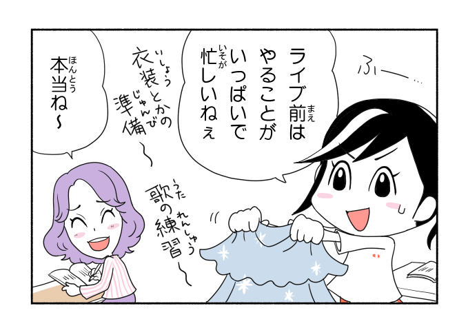 【声優エッセイ漫画】れれれのさつきさん vol.76 「逆転の発想」|れれれ委員会 #note note.com/rerereno_satsu… 新作更新しました!ライブ前にさつきさんが気付いたこととは?😆 #ゆきのさつき #倉田雅世 #氷上恭子 #波多野家 #れれれのさつきさん #声優 #四コマ漫画 #漫画が読めるハッシュタグ