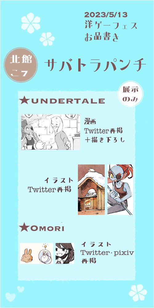 5/13洋ゲーフェス【北館こ7】にてUNDERTALEとOMORIのイラスト・漫画の展示で参加します。展示のみなので、お買い物の休憩がてらどうぞ気軽にお立ち寄りください〜! pictsquare.net/6b22yg9hil8f8h… #洋ゲーフェス