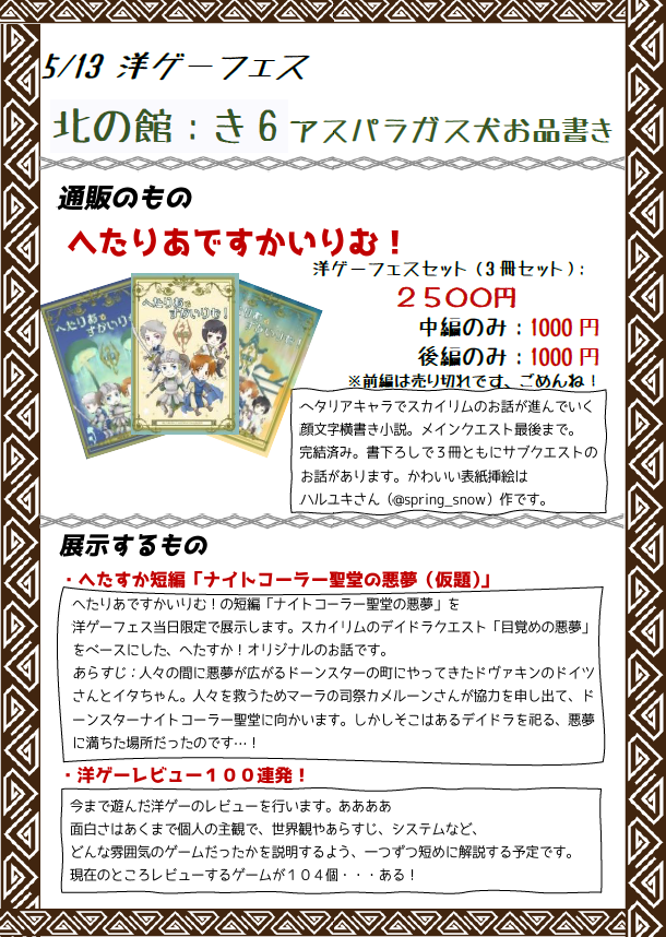 #洋ゲーフェス 5/13に開催の洋ゲーフェスのサクカとお品書きができました 新刊(3Dera本)が出ます わーい 当日はネップリと間に合えば無料展示がある予定 よろしくお願いします 新刊サンプルはこちら→poipiku.com/3214571/869847…