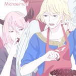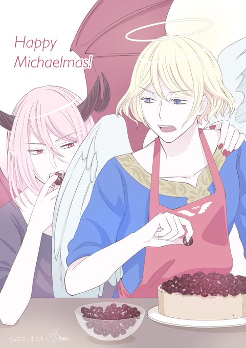 #9月29日は天使の祝日ミクルマス #洋菓子の日 #聖ミカエル祭 #ブラックベリーの藪に突っ込んだサタンもよろしく ミカエルの日なので今年もサタンとミカエルを描きました。 フランスでは菓子職人の守護をしてるとのことでお菓子作りをしているミカエルさん。それを邪魔するサタンさんです。