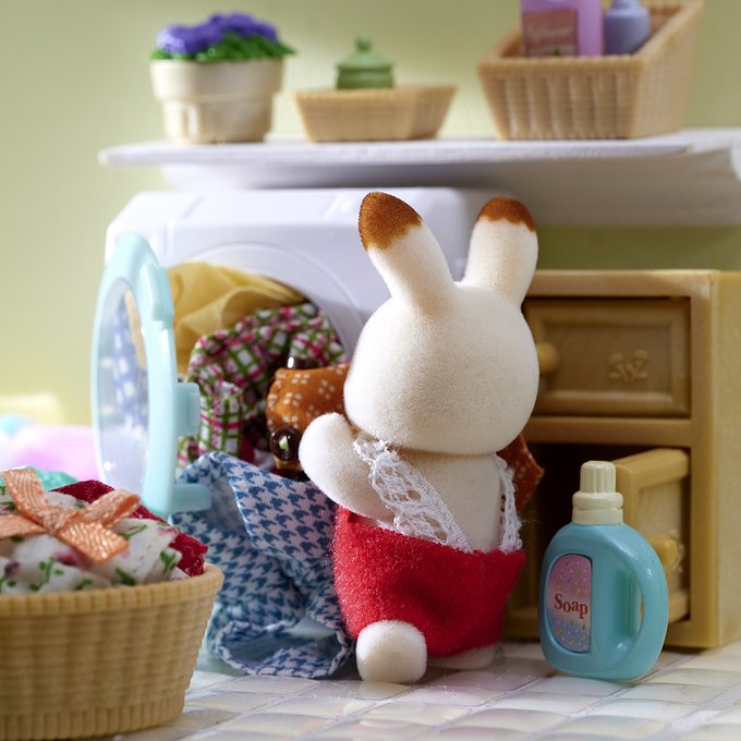 ショコラウサギのクレムはおせんたくのお手伝い中👚 「これもいれないと!…あれ?はいらないです~」 せんたく機にはもう入らないみたい💦 もう一回お手伝いが必要みたいですね♪ #シルバニアファミリー #シルバニア #洗濯 #お手伝い #お片付け #シルバニア赤ちゃん #育児あるある #子育てあるある