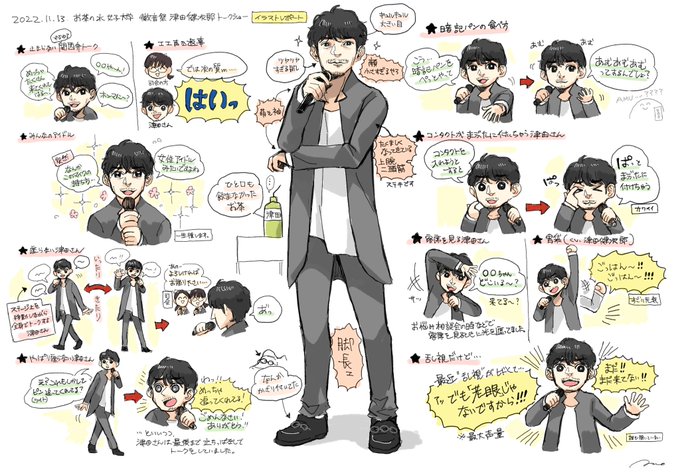 #お茶の水女子大学 の #徽音祭 にて行われた「#津田健次郎トークショー 」での津田さんの様子を、イラストレポにまとめてみました。今回描いたところ以外にも可愛い瞬間はたくさんあったのですが、少しでも雰囲気が伝われば幸いです🙏 #津田健次郎 #津田健次郎さんファンアート
