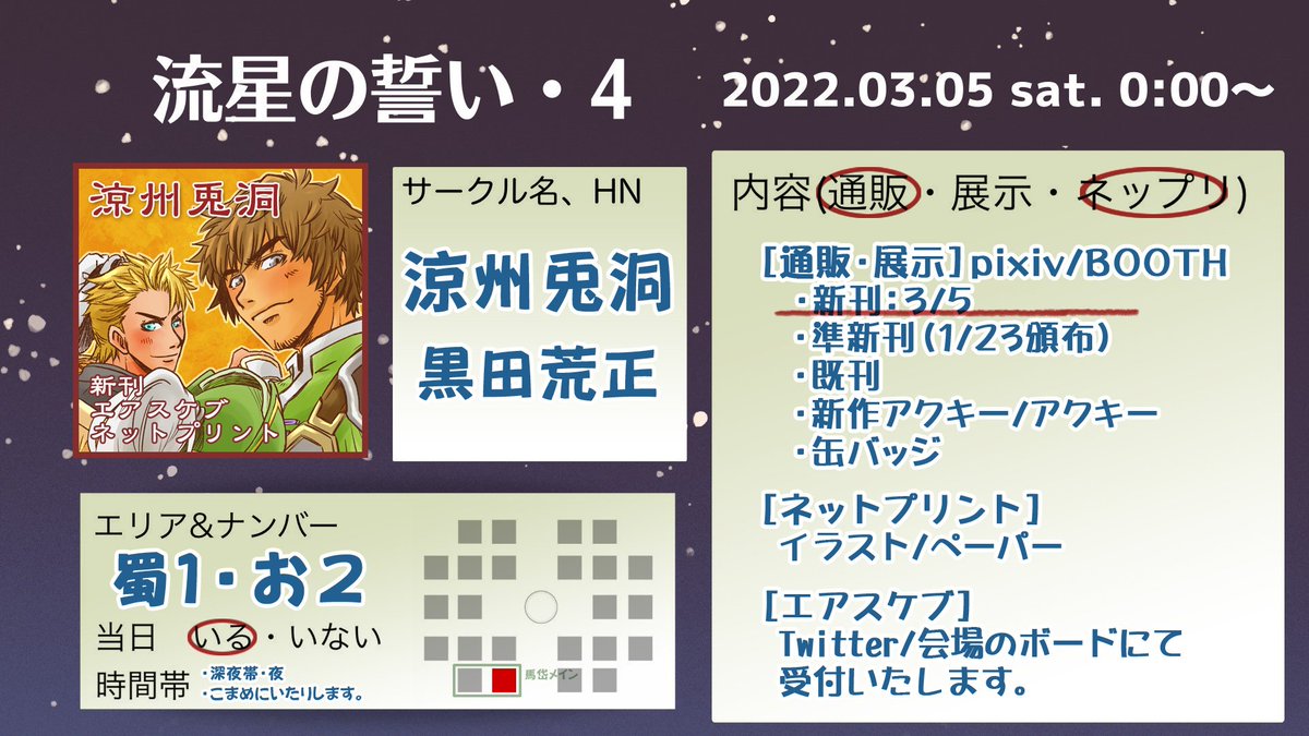 #流星の誓い 流星の誓い参加しております!! [蜀1・お2]涼州兎洞 ネップリとエアスケブはリプライにまとめますね。本日は皆さんよろしくお願いします☺️✨ [通販・お知らせ] BOOTH usagidoh.booth.pm ピクスペ pictspace.net/wdejyeiob64rub… [展示・お知らせ] Pixiv pixiv.net/users/60165490