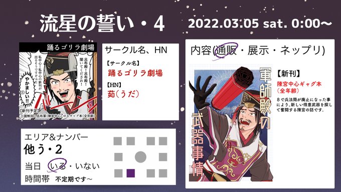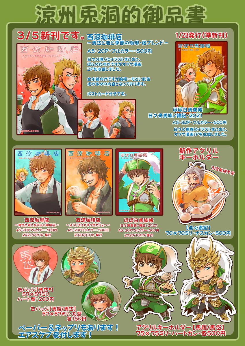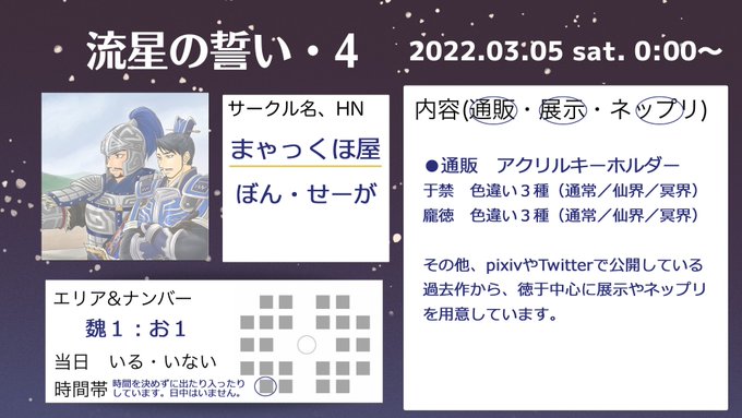 #流星の誓い告知 お品書きできました! 3/5Webオンリー「流星の誓い4」馬岱メインで参加します! [蜀1・お2]涼州兎洞 詳細はスペース店舗内とPixiv/BOOTH/Twitterにて順次お知らせしていきますね。エアスケブも予定しております! 皆さんよろしくお願いします! BOOTH usagidoh.booth.pm