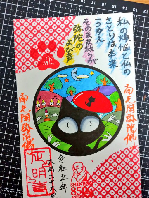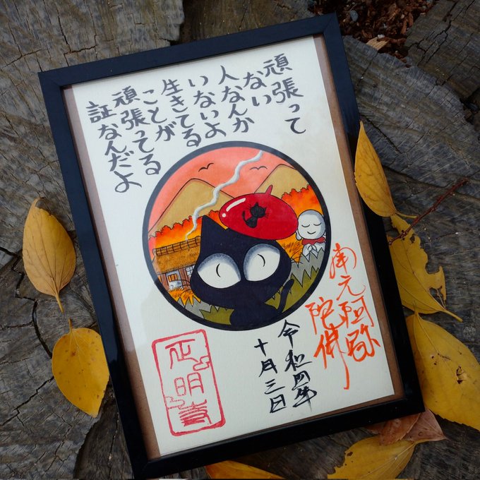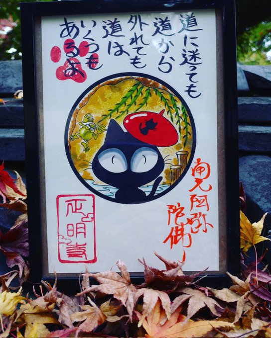 日本で初めて浄土真宗イラスト御朱印を作ったスタジオ猫柳です🐱 黒猫は厄除けや魔除けの効果があると江戸時代に人気だったのはご存知ですか? 浄土真宗イラスト御朱印を飾り厄払いしませんか😊 #イラスト #絵描きさんフォロバ100 #冬の創作クラスタフォロー祭り #御朱印 #浄土真宗