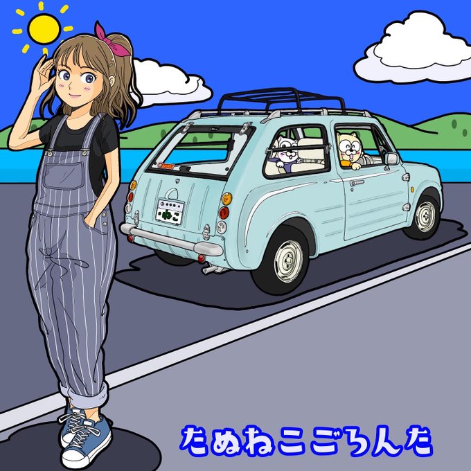 おはようございますニャン⁽⁽ ◟(∗ ˊωˋ ∗)◞ ⁾⁾ 本日も頑張って参りましょうにゃ! #猫好きさんと繋がりたい #車好きな人と繋がりたい #イラスト好きさんと繋がりたい #昭和 #80年代 #旧車 #日産パオ #絵描きさんと繋がりたい #パイクカー #浜田省吾
