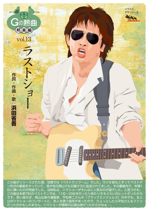 「Gの熱曲邦楽編」13回目。今回は固定ツイートでも予告していた #浜田省吾 さんです😀。曲は「ラストショー」。全国的にヒットした曲ではありますが、我が岡山では年間1位になるほどの大ヒットでした😙。 #絵描きさんと繋がりたい