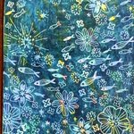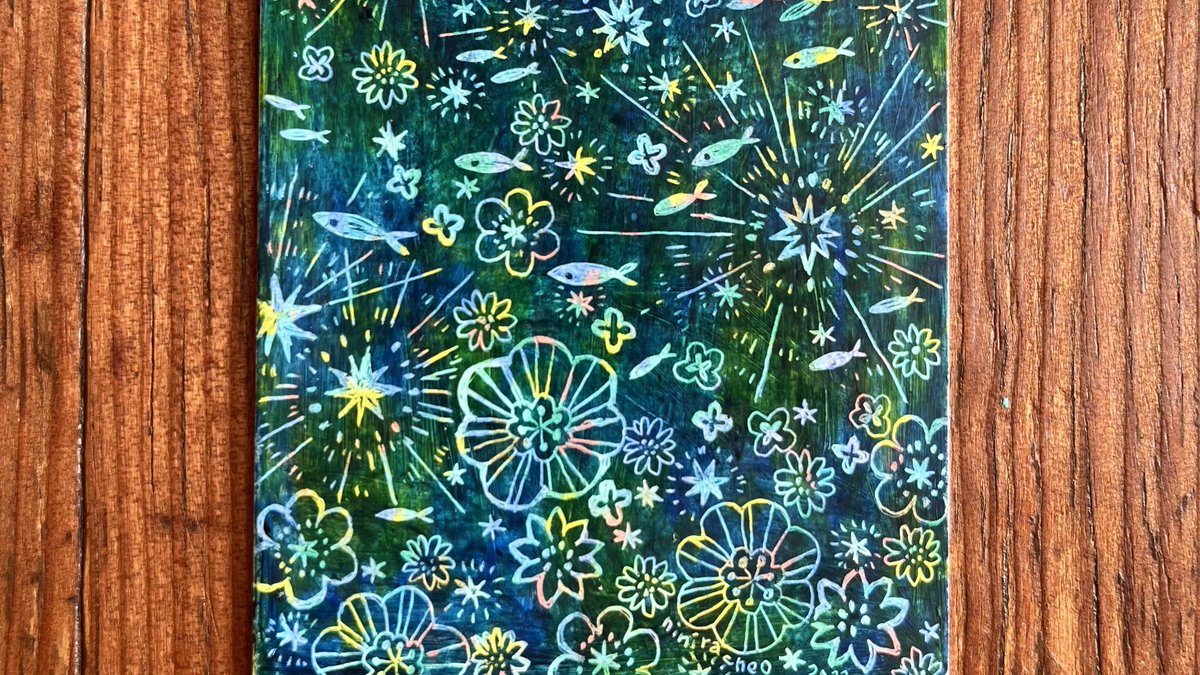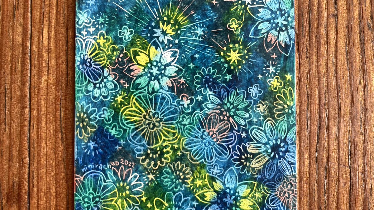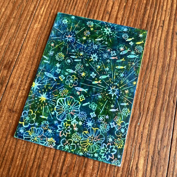 お誕生日にいただいた、 #海のクレヨン で一発描きスクラッチやってみました〜 他の画材は使わず描いたので、いつもより下の色が透けてますが、それはそれできれいな気もする。発色も良いですね…! #スクラッチ絵制作過程 #スクラッチ絵を流してスクラッチ絵描きを増やす