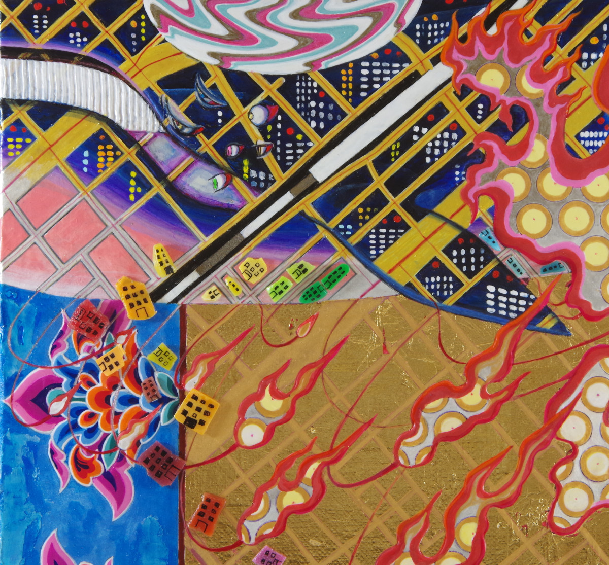 Any Kobe 展示作品 「TOKYO MONSTER_GoTo極楽8」 アクリル絵具、東京の地図、真鍮箔、海岸のプラスチック片、ペン、カンバス 72.7×60.6cm (F20) 2022 現代を生きる苦悩と未来への希望を表現 #anykobe #anykobewitharts2022 #海洋プラスチック #marineplastic #contemporaryart #現代アート