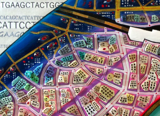 TOKYO MONSTER 「GoTo極楽_6」 アクリル絵具、東京の地図、真鍮箔、海岸のプラスチック片、ペン、カンバス F3 2022 #現代アート #contemporaryart #art #marineplastic #海洋プラスチック #芸術の輪 #みんなで楽しむTwitter展示会 #artilljp #木白牧