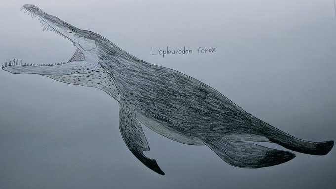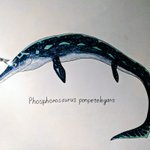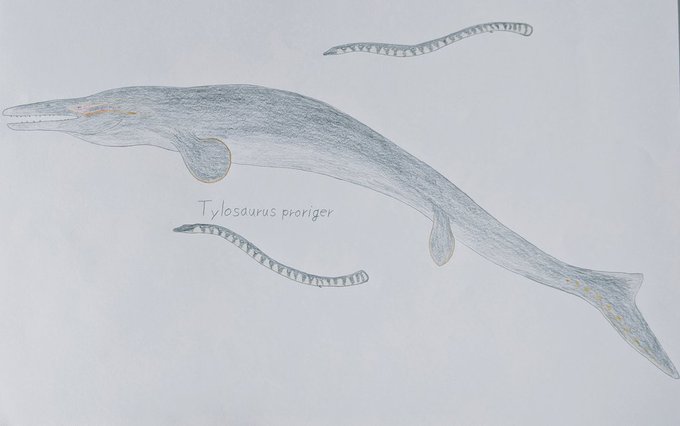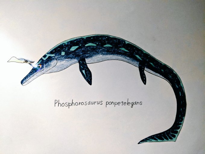 フォスフォロサウルスを描きました!!このP.ポンテレガンスは北海道のむかわ町穂別地域で発見されました。 小型のモササウルス類で大きな目を持っているからなのか、原始的な魚竜に似ていてかわいいですねぇ。 #フォスフォロサウルス #海生爬虫類
