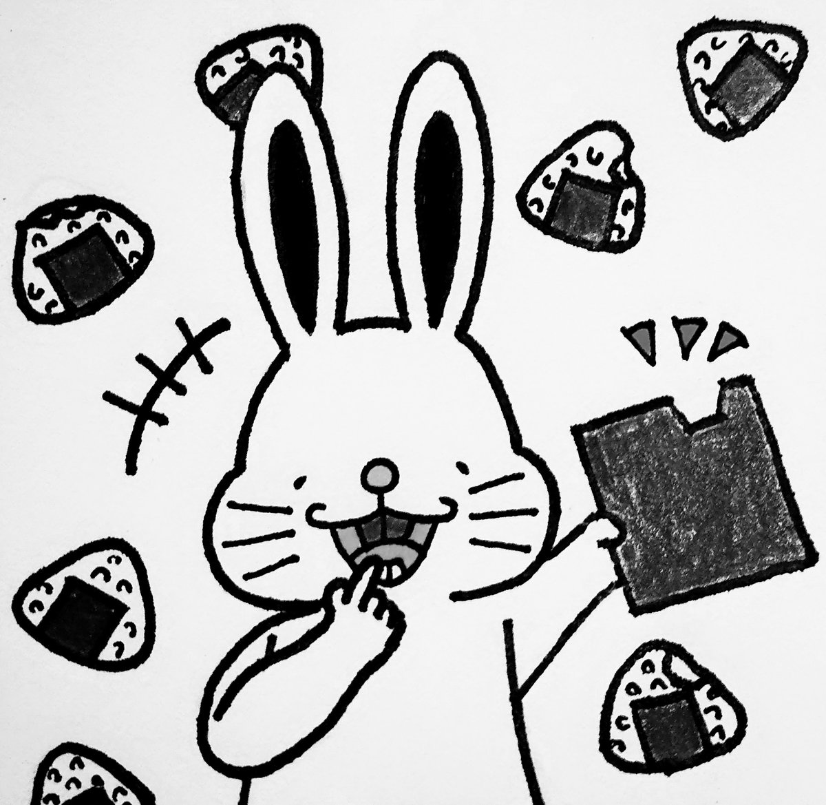 こんにちは!🌈👀 前歯うさぎさんです🐰🥕 今日は9月6日(くろの日)なので、久々に白黒です🍙✨ 【みんなでおにぎりを作ろう! ~前歯に海苔!どぉ?~】 #イラスト #前歯うさぎ #イラスト好きさんとつながりたい #絵描きさんと繋がりたい #rabbit #illustration #art #design #黒 #海苔 #9月6日