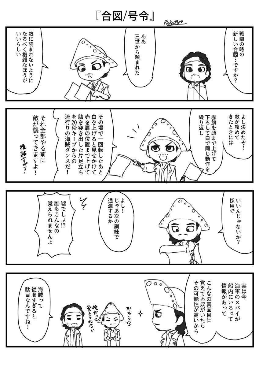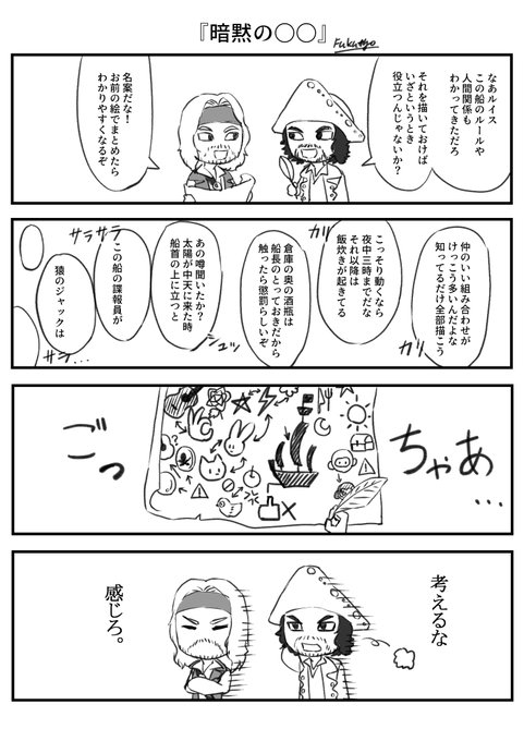 #海賊版深夜の真剣創作60分一本勝負 ⭐️【荒天/荒波】ゲームのやり方⭐️ (参加人数:2〜4人+1人) ①酒を飲みすぎて今にもヤバそうな海賊を用意します。 ②ヤバそうな海賊に対して、順番に不意打ち等で刺激を与えましょう。 ③ヤバそうな海賊の限界ラインを突破させた人が負けです。