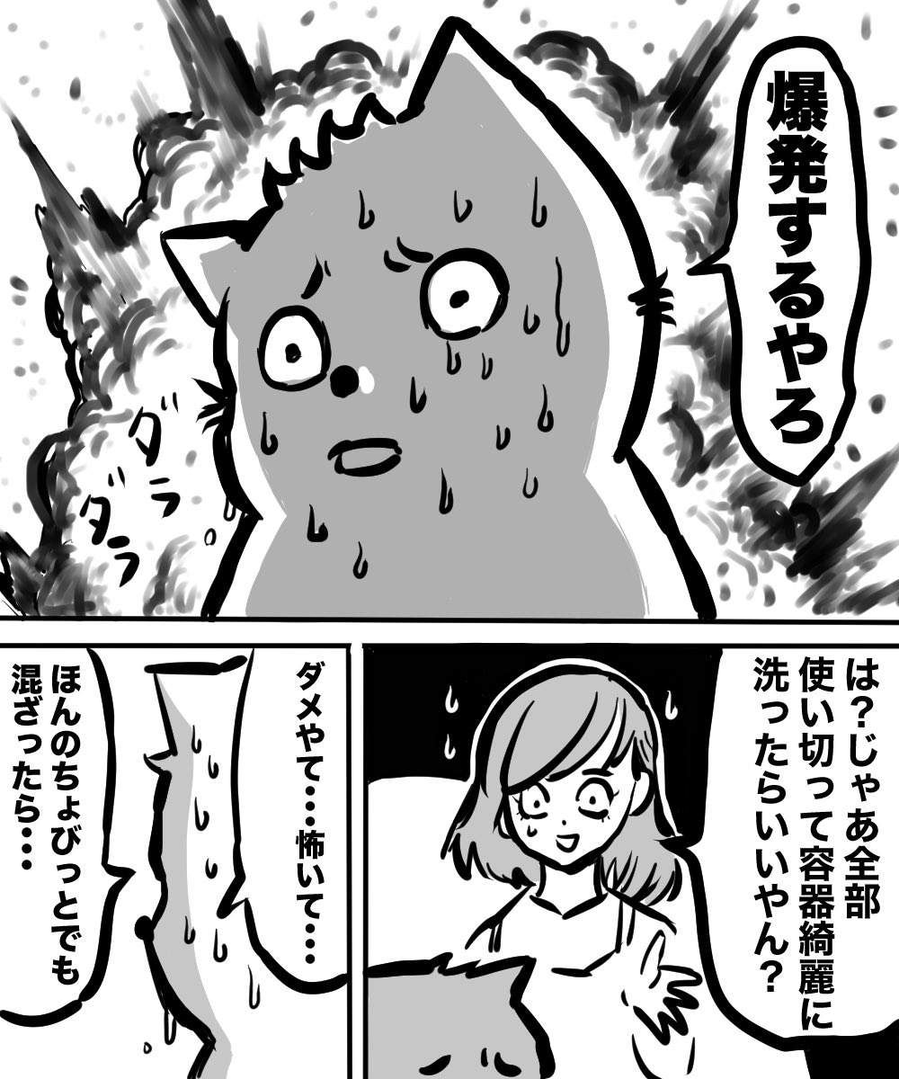 「とにかく混ざると全部爆発すると思ってる奴」 何かで記憶植え付けられたんでしょうね💦 ↓ブログ「もみあげカワウソのマンガな話」 harumaki-manga-energy.com #漫画が読めるハッシュタグ #漫画 #混ぜるな危険