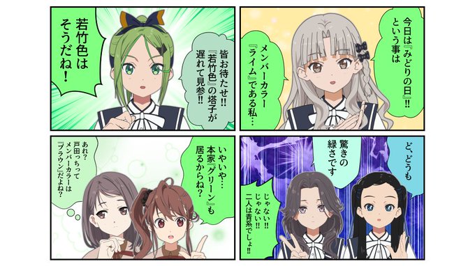 今日は #みどりの日 という事で緑メンバー大集合! 懐かしのメンバーも出せたし #ナナニジライブ2023 の #清井美那 さんの 「じゃない!!じゃない!!」 が微笑ましかったので 早速使わせていただきました。 観てない方はバーチャル定期公演へ💨。 #ナナニジ #ナナニジファンアート twitter.com/227_staff/stat…